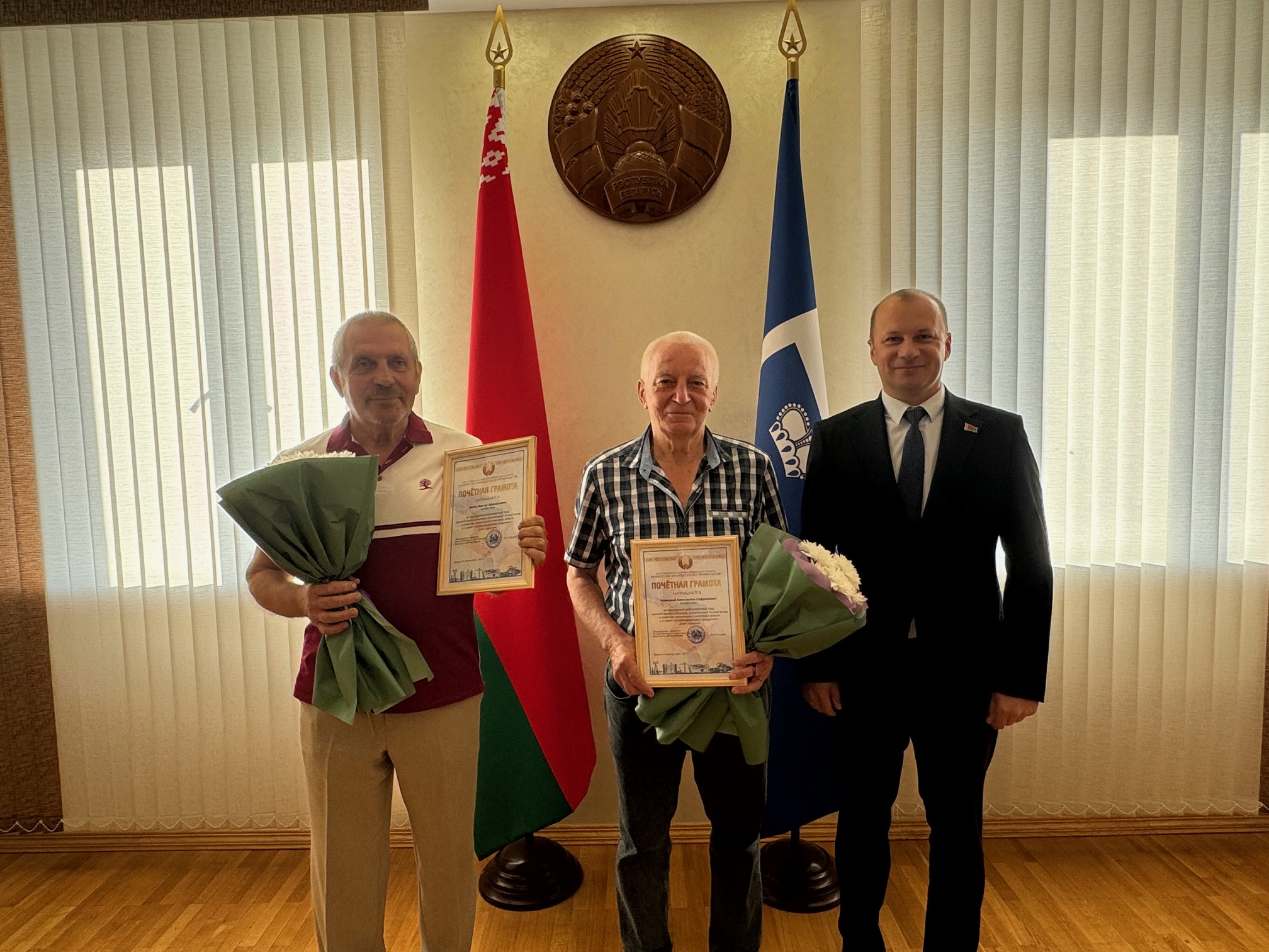 Сегодня, 8 августа, председатель райисполкома Александр Савина вручил почетные грамоты ветеранам труда нашего района: директору УП «УКС Лунинецкого района» Виктору Белко и архитектору города Константу Новицкому.